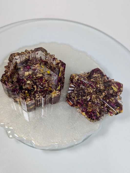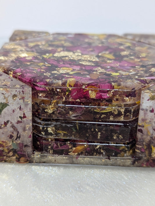 Rose Petals with Gold Flakes Resin Coaster Set with Stand