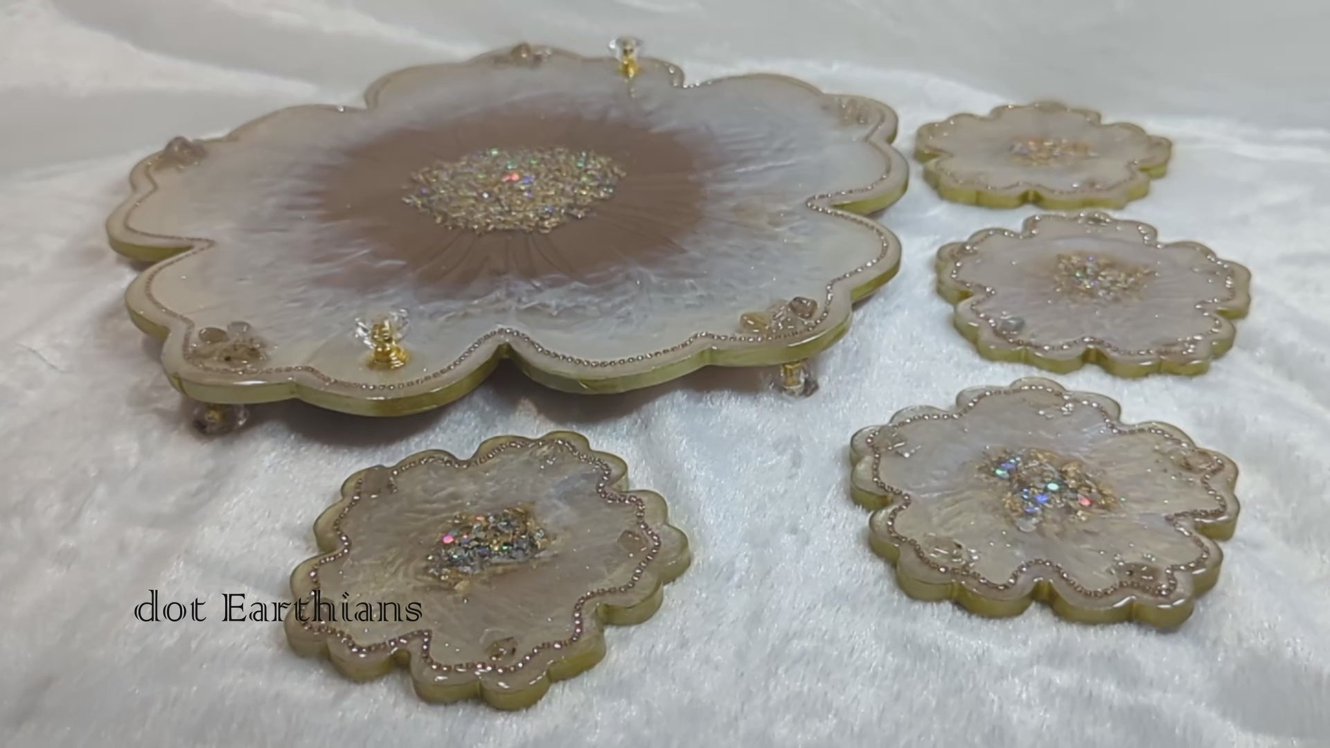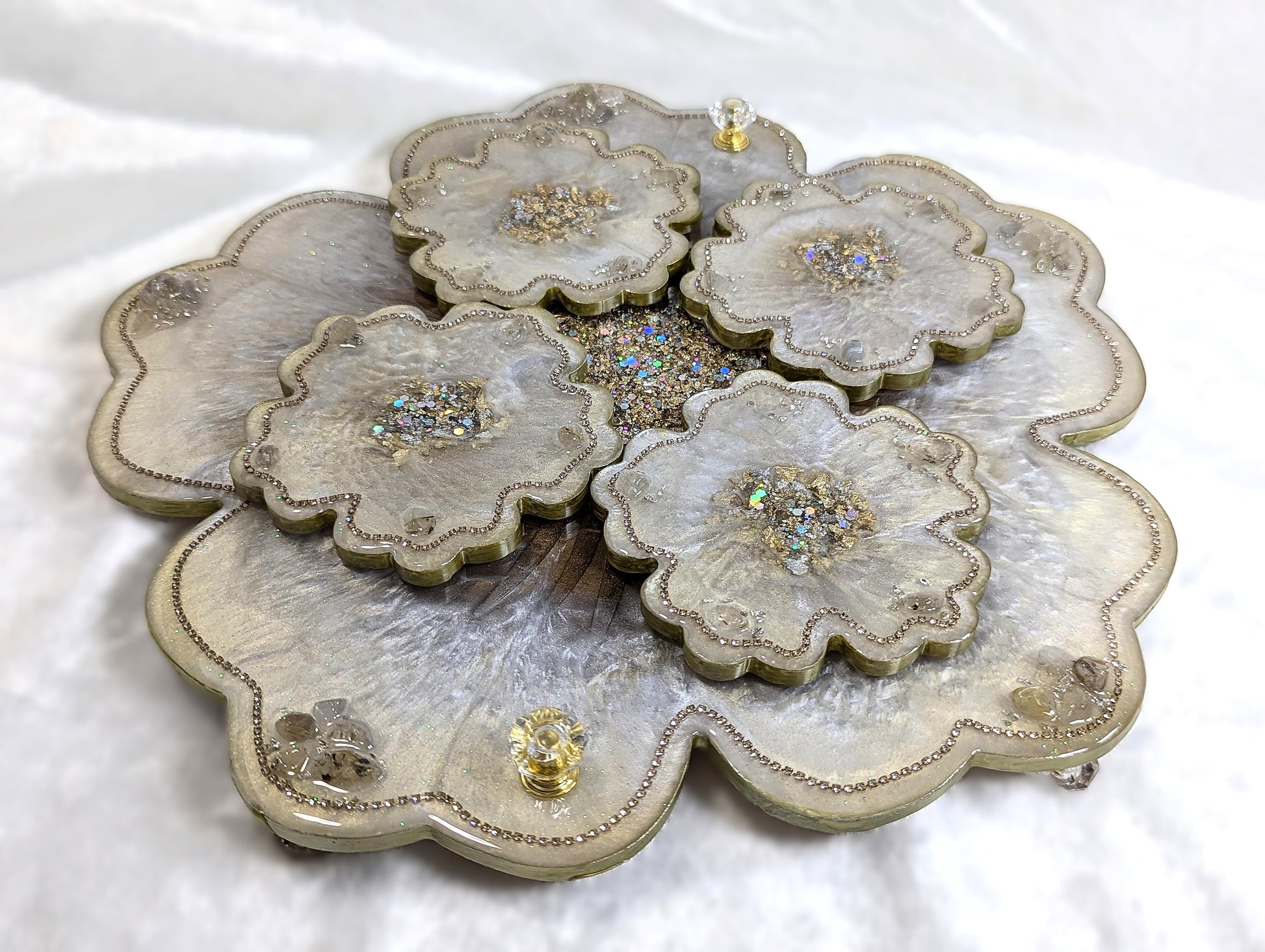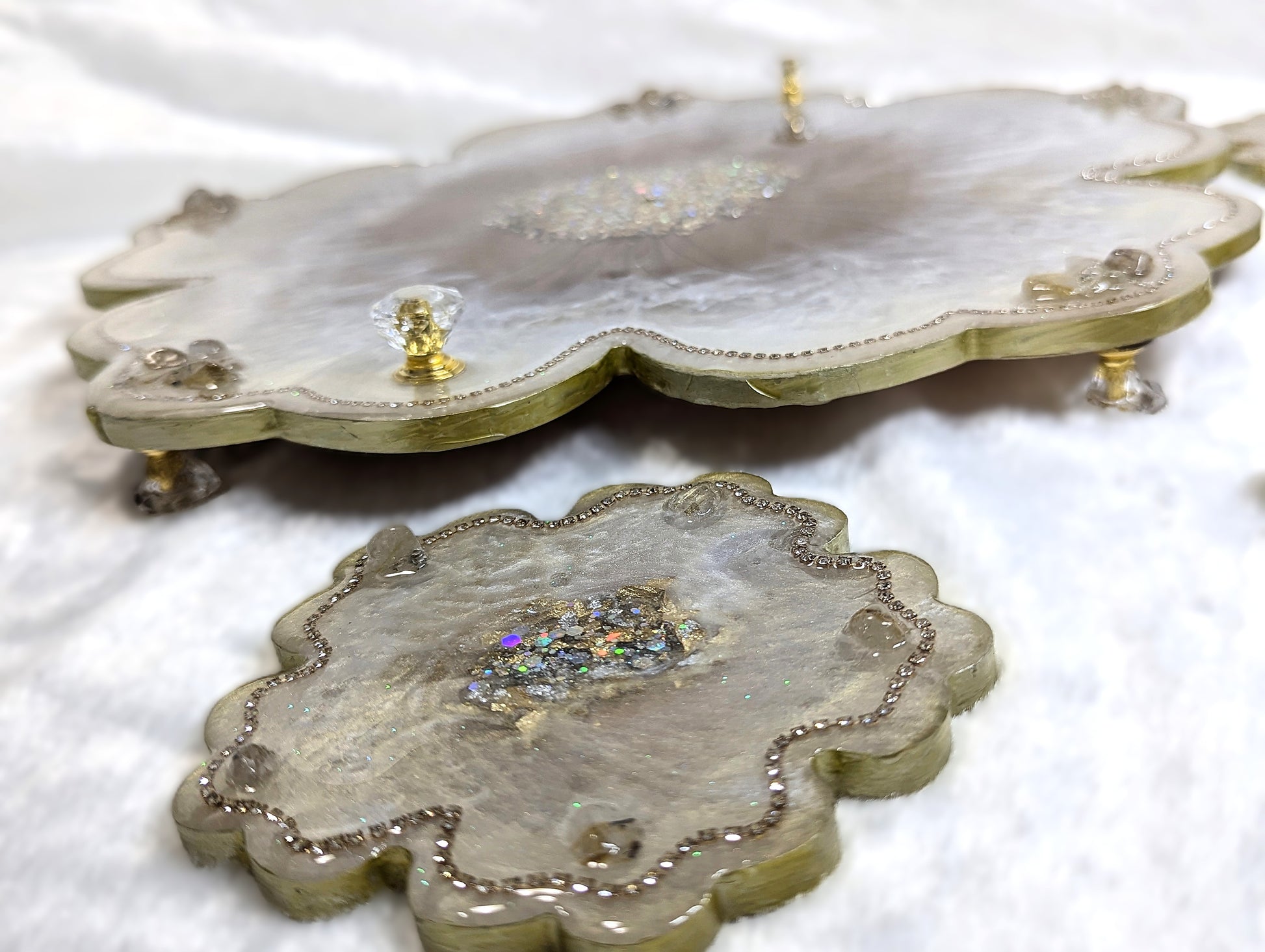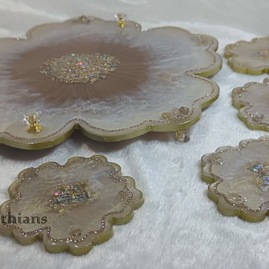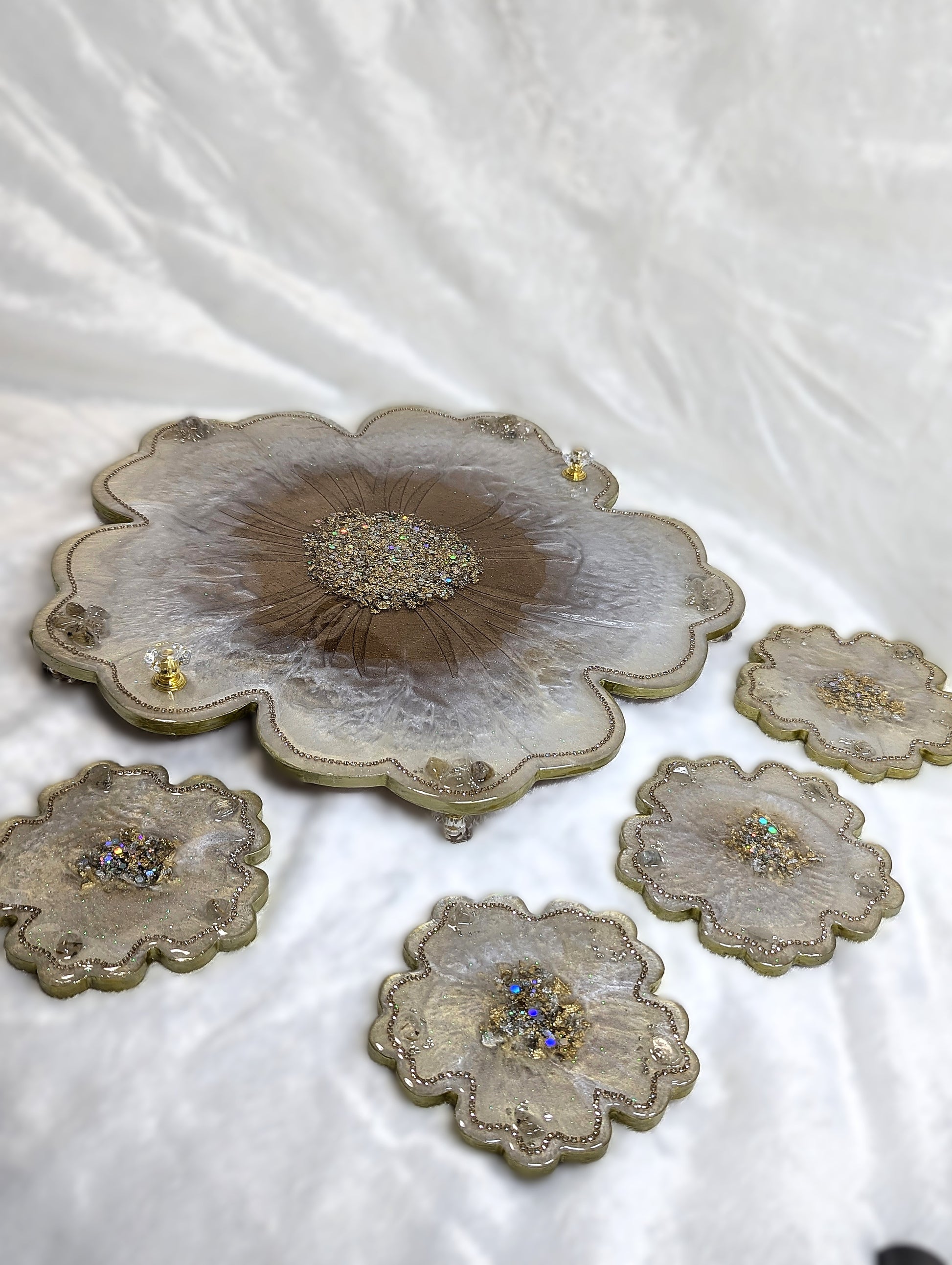 Custom handmade large resin tray set with 4 coasters made with stones, rhinestones, gold leaf, and glitter. The tray comes with non-slippery bumpers underneath with matching handles. Pearl and bronze shiny beautiful surface highlighting the amazing design. This product is food-safe and water-resistant.